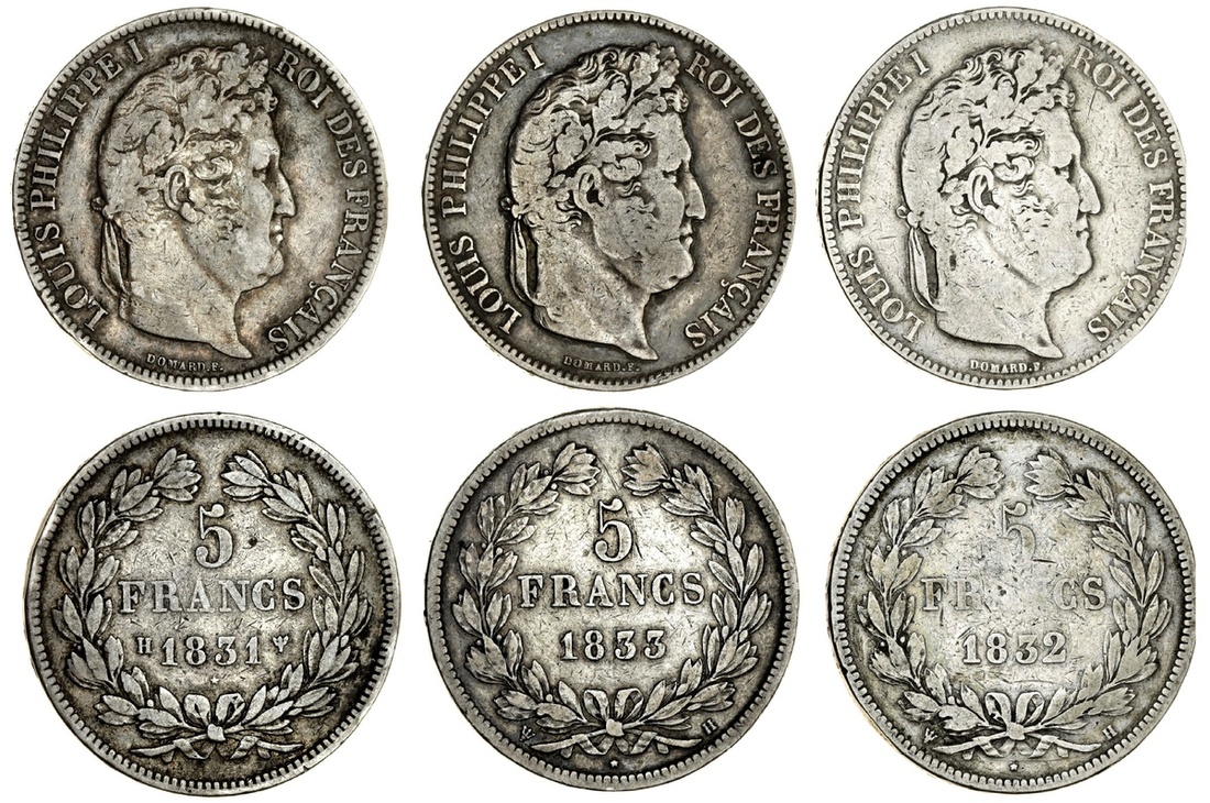 France, Restored Kingdom, Louis-Philippe I (1830-48), 5-Francs, La Rochelle [H] (3), transitional type, 1831-H; also, 2e type, 1832-H; 1833-H (Le Franc 324, 5, 18; KM 745, 749.5), the second once cleaned, otherwise all fine or near so, all scarce (3)