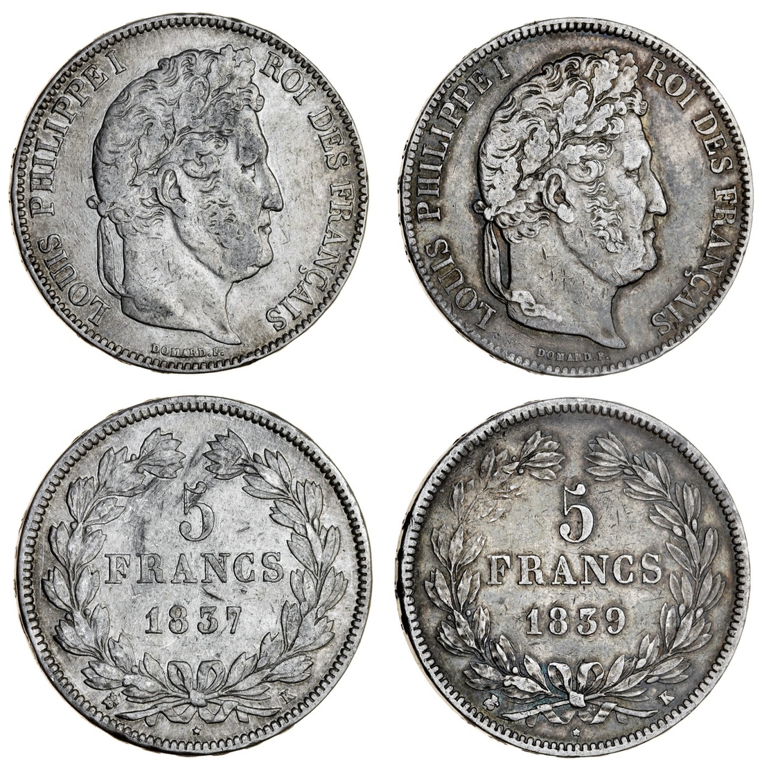 France, Restored Kingdom, Louis-Philippe I (1830-48), 5-Francs, Bordeaux [K], 2e type (2); 1837-K; 1839-K (Gad 678A; Dav. 91; KM 749.7), the first cleaned, otherwise a bold fine, the second toned, good fine, both scarce dates in series