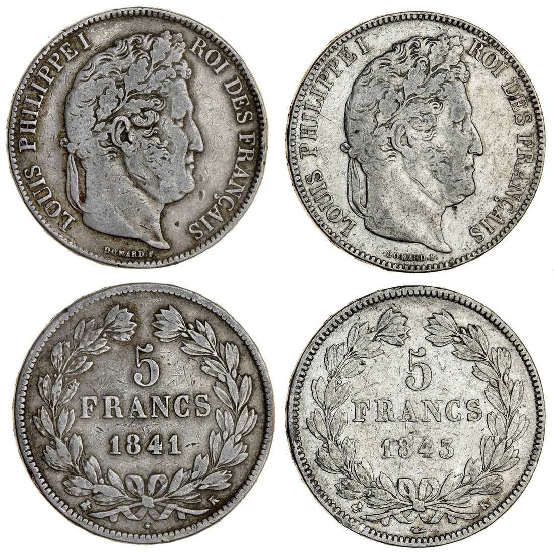 France, Restored Kingdom, Louis-Philippe I (1830-48), 5-Francs, Bordeaux [K], 2e type (2), 1841-K; 1843-K (Gad 678A; Dav. 91; KM 749.7), the second cleaned, otherwise both fine or near so and scarce (2)