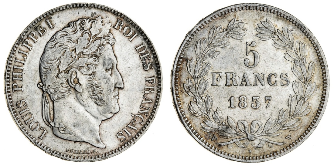 France, Restored Kingdom, Louis-Philippe I (1830-48), 5-Francs, 1837-W, Lille, 2e type (Gad 678; KM 749.13), lustrous, very fine or better