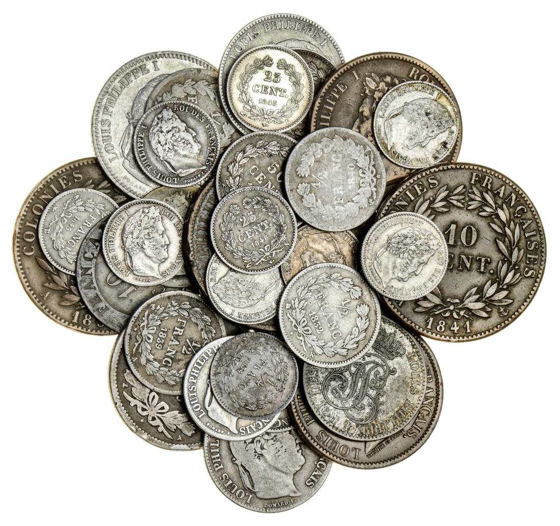 France, Restored Kingdom, Louis-Philippe I (1830-48), 2-Francs {4}, 1833-A, Paris; another, 1842-W, Bordeaux; another, 1842-[?]; and, 1846, counterfeit (Le Franc 260; Gad 520); also, Francs {2}, 1845-B, Rouen; another, 1847-A, Paris (Le Franc 210.101, 114; Gad 453; KM 748.1, 2); Half-Francs or 50-Centimes {9}, Paris {5}, 1839-A; 1840-A; 1846-A; 1847-A; another, dateless due to solder; Rouen, 1845-B; Bordeaux, 1832-K; Lille [2], 1832-W; another, 1834-W (F.182, 183; Gad 408, 410), fair to fine; Quarter-Francs or Quarts {25-Centimes} [10], Paris [4], 1834-A; 1835-A; 1846-A; 1848-A; also, Rouen, 1845-B [3], first type ‘1/4 Franc’; also, ‘25 Cent.’ [2]; lastly, Lille [3], 1833-W; 1839-W; lastly, 1844-W (Gad 355, 357; KM 740.1, 755.1, 2), some lightly cleaned, another formerly cufflink mounted, others lustrous, fine to extremely fine [25]