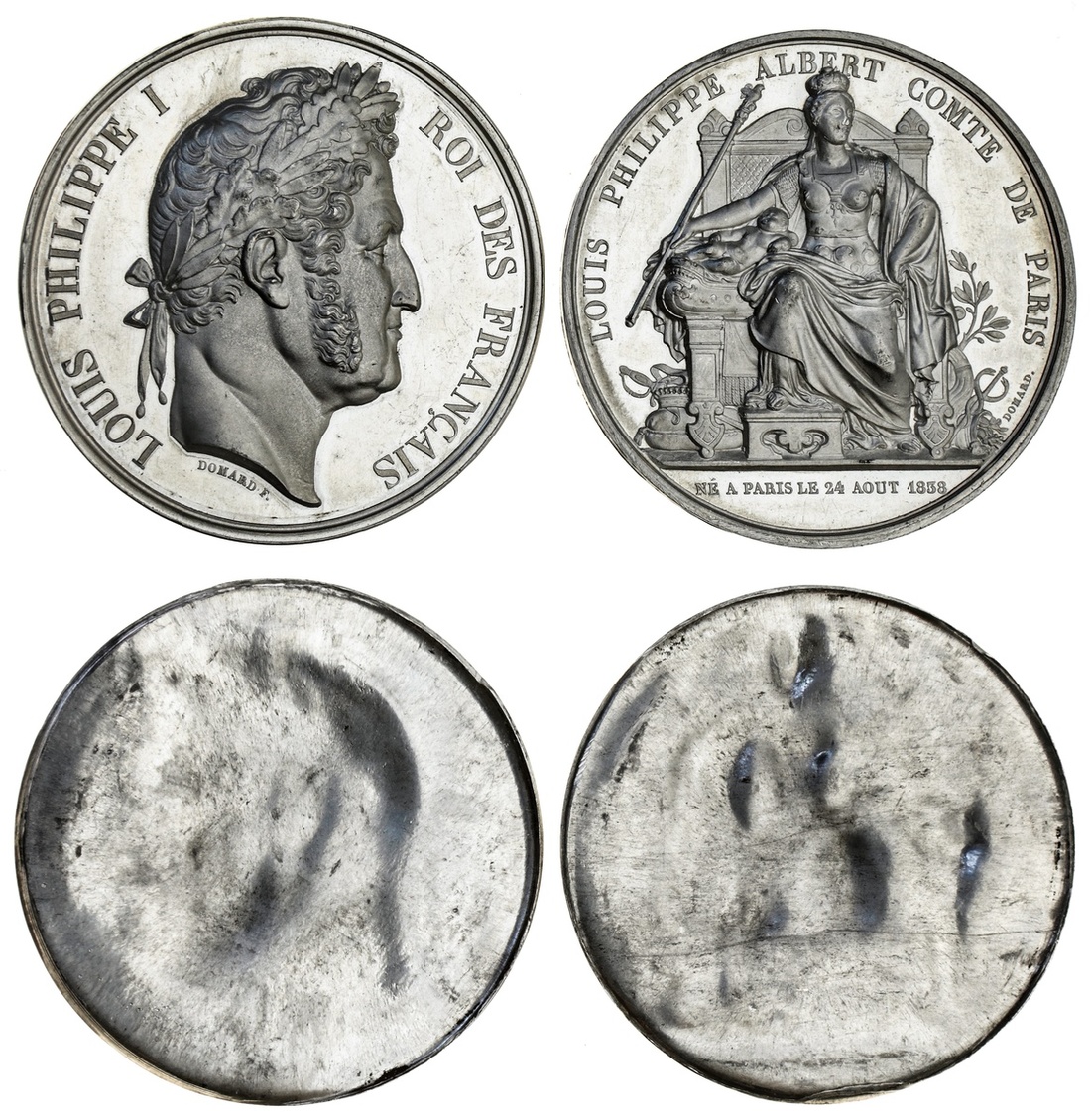 France, Restored Kingdom, Birth of the Count of Paris, (1838), Uniface WM Clichés, after J F Domard, 68.5mm. [2], obv: Louis Philippe laureate head right, rev. "LOUIS PHILIPPE ALBERT COMTE DE PARIS | NE A PARIS LE 24 AOUT 1838 (Collignon -), flashy and lustrous, better than extremely fine [2]
