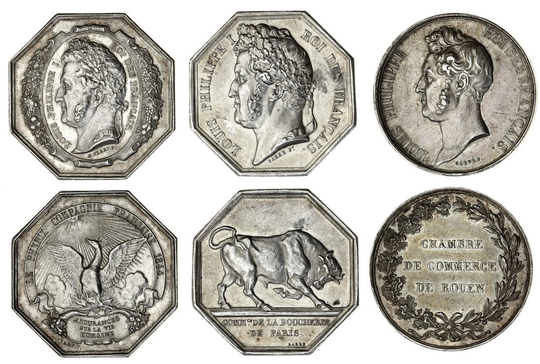 France, Restored Kingdom, Louis Philippe I (1830-48), AR Jettons [3], Commerce de la Bouchérie, Paris, octagonal, by Barré, 36mm., lamp on edge; another, Le Phenix Compagnie Francaise, 1844, octagonal, by Féart, 36mm., stamped ARGENT on edge; lastly, Chambre du Commerce de Rouen, by Caqué, 35mm., hairlines, otherwise very fine or better, the first scarce [3]