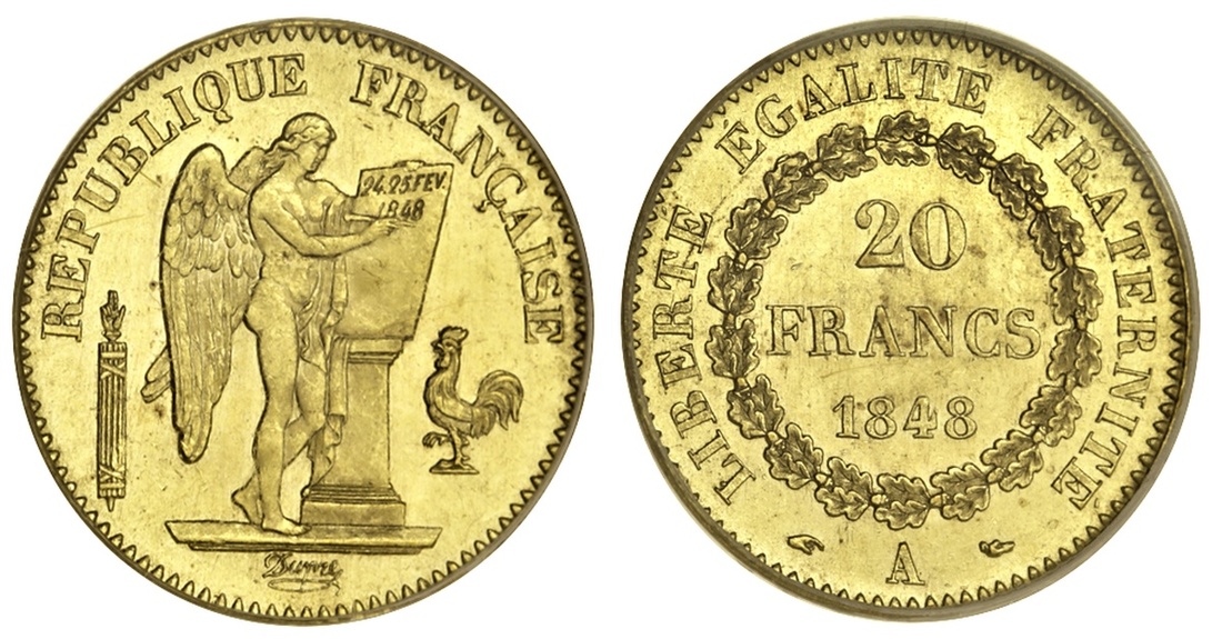 (g) France, Second Republic (1848-52), gold 20-Francs, 1848-A, Paris (Le Franc 528.1; Fb 565; Gad 1032; KM 757), in PCGS holder, graded MS64