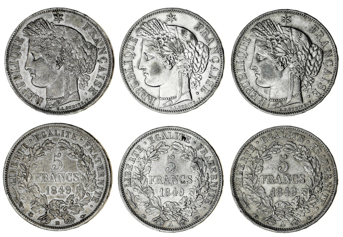 France, Second Republic (1848-52), 5-Francs, 'Ceres' type, 1849 (3), Paris, 1849-A [2], mains-chiens {hand-dog}; another, similar; also, Strasbourg, 1849-BB (Le Franc 327.1, 3; Gad 719; KM 761.1, 2), all lightly cleaned, otherwise all a bolder very fine, the last scarcer (3)