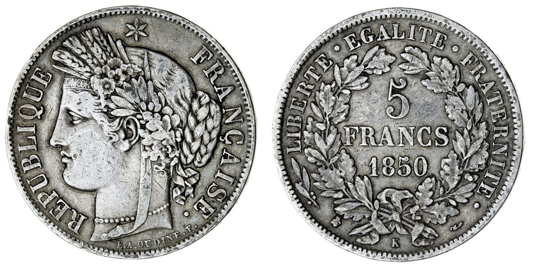 France, Second Republic (1848-52), 5-Francs, 1850-K, 'Ceres' type, Bordeaux (Le Franc 327.6; Gad 719; KM 761.3), toned, good fine, the key date for type, scarce thus