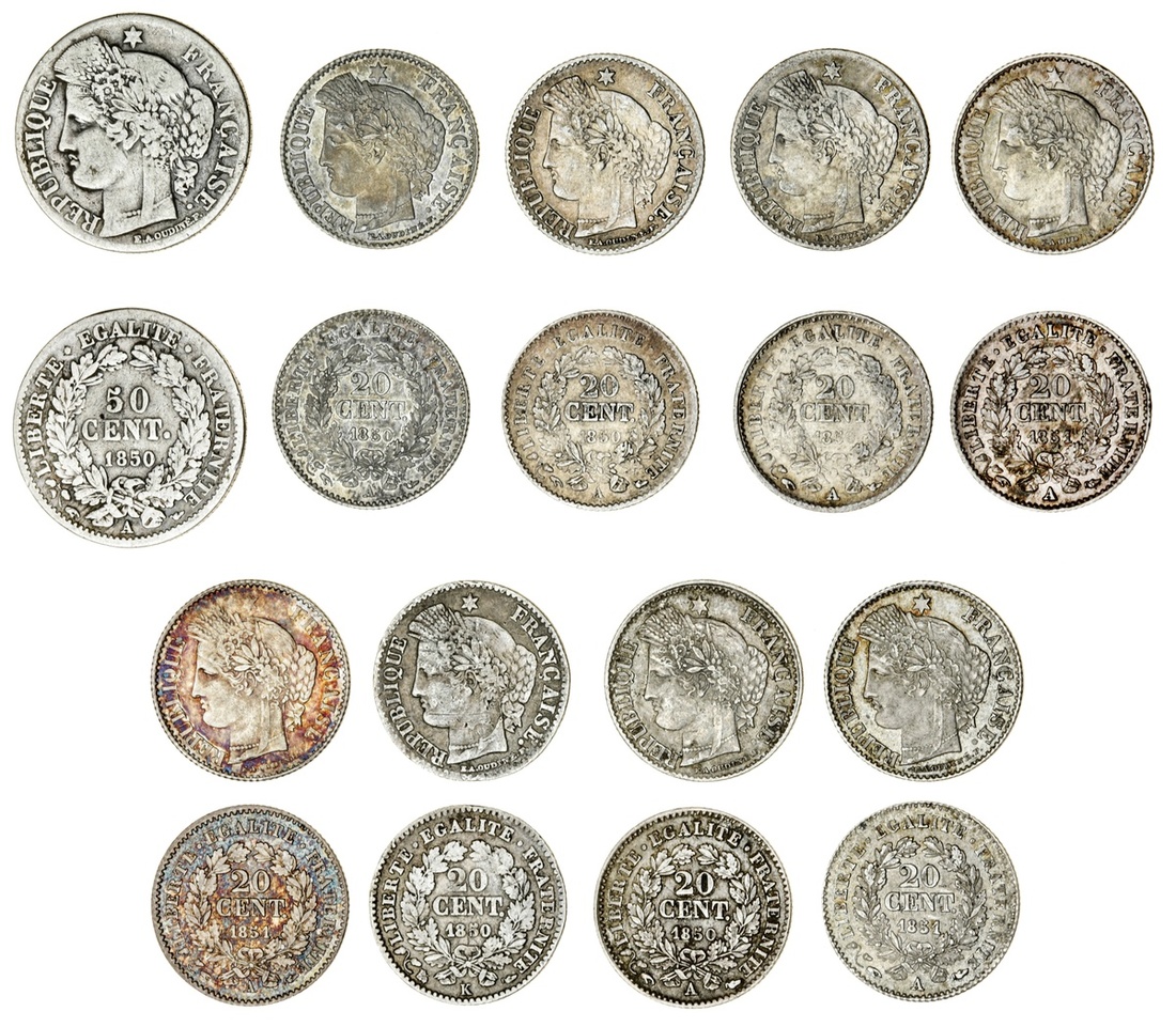 France, Second Republic (1848-52), 'Ceres' types [9], 50-Centimes, 1850-A, Paris (Le Franc 184.2; Gad 411; Maz 1193; KM 769.1); also, 20-Centimes (8), Paris {7], 1850-A {4}; 1851-A {3}; also, Bordeaux, 1850-K (Le Franc 146.3, 5; Gad 303; KM 758.1, 3); fine to very fine, variable tone, all scarcer types (9)