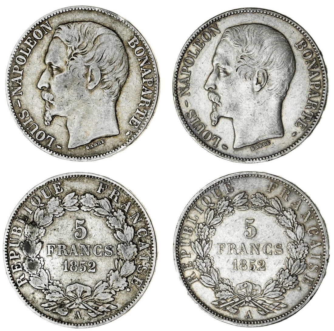 France, Second Republic, 'Louis-Napoléon Bonaparte' {Napoleon III} (1852), 5-Francs, 1852-A Paris (2), smaller bust, normal goatee; and larger bust, twisted goatee (Le Franc 329.1, 2; Gad 726; KM 773.1), the first wiped, otherwise very fine, the second toned, about fine (2)