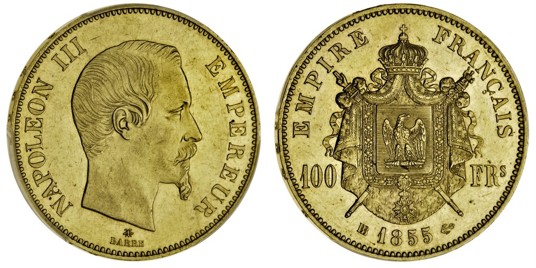 (g) France, Second Empire, Napoléon III (1852-70), gold 100-Francs, 1855-BB, Strasbourg, bare head (Gad 1135; Maz 1405; Schlumberger 263; Fb 570; KM 786.2), a scarce date in series with a reported mintage of 5,031, in PCGS holder, graded MS61PL