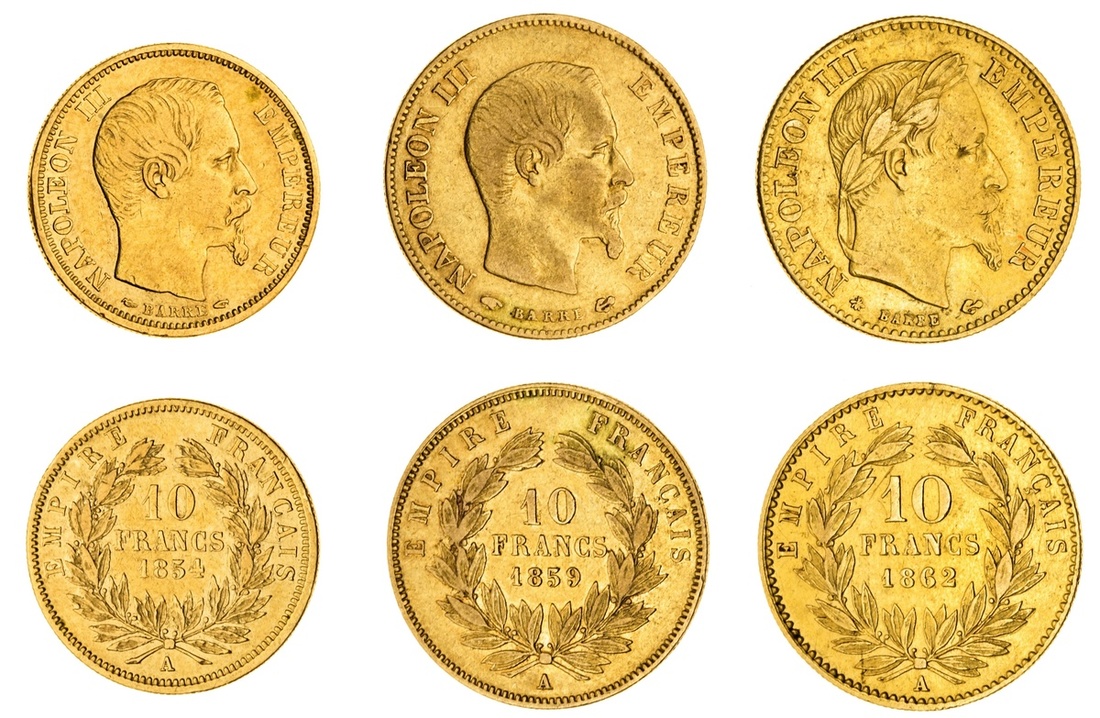 (g) France, Second Empire, Napoléon III (1852-70), gold 10-Francs [3], small module flan, 1854 (Gad 1013; Maz. 1452; Fb 576), good fine, rare; large flan [2], 1859, bare head; another, 1862, laureate head (Le Franc 506; 507), the first fine, the second about very fine [3]