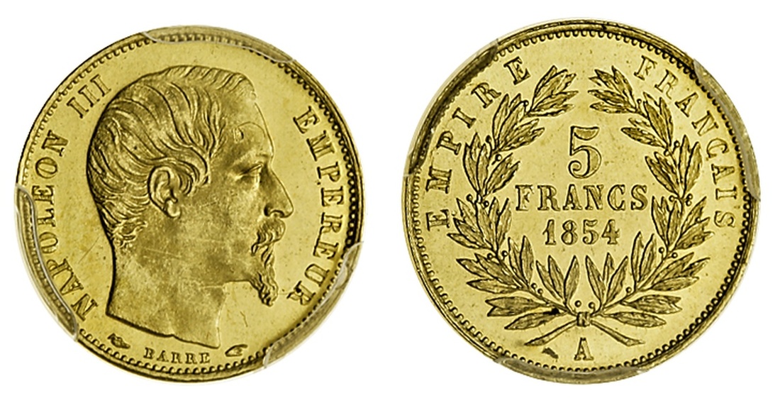 (g) France, Second Empire, Napoléon III (1852-70), gold 5-Francs, 1854-A, Paris, small flan issue, "tranche lissé" type, edge plain (Le Franc 500.1; Gad 1000; Fb 578; KM 783), a most choice example with attractive cartwheel mint lustre, in PCGS holder, graded MS65, one of the finest extant on the population report