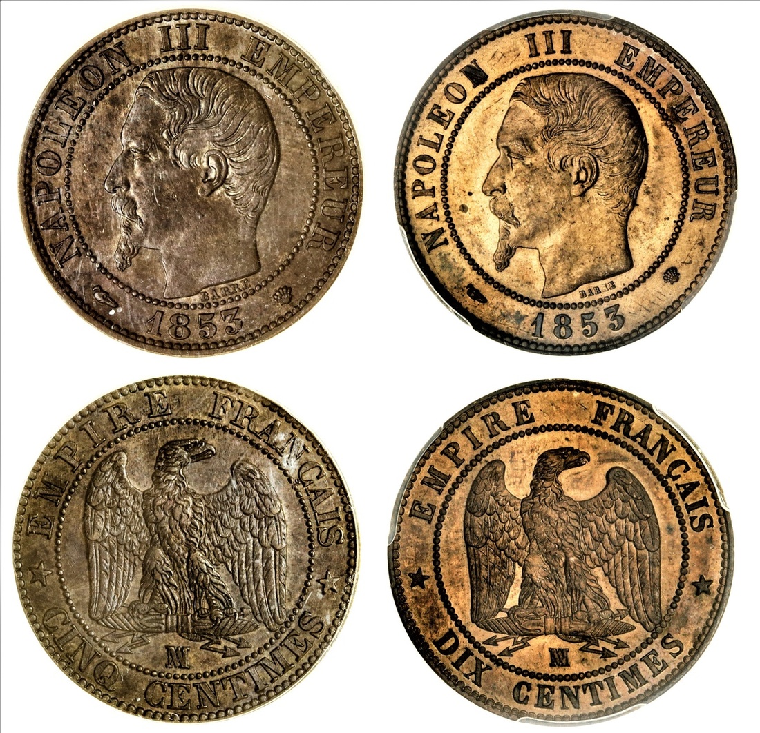 France, Second Empire, Napoléon III (1852-70), 10-Centimes, 1853-MA, Marseille (Gad 248; Maz. 1562), once very lightly wiped, otherwise lustrous, much as struck, in early PCGS details holder, graded UNC - Questionable Colour; also 5-Centimes, 1853-MA, Marseille (Gad 152), rare, in early PCGS holder, graded AU58 [2]