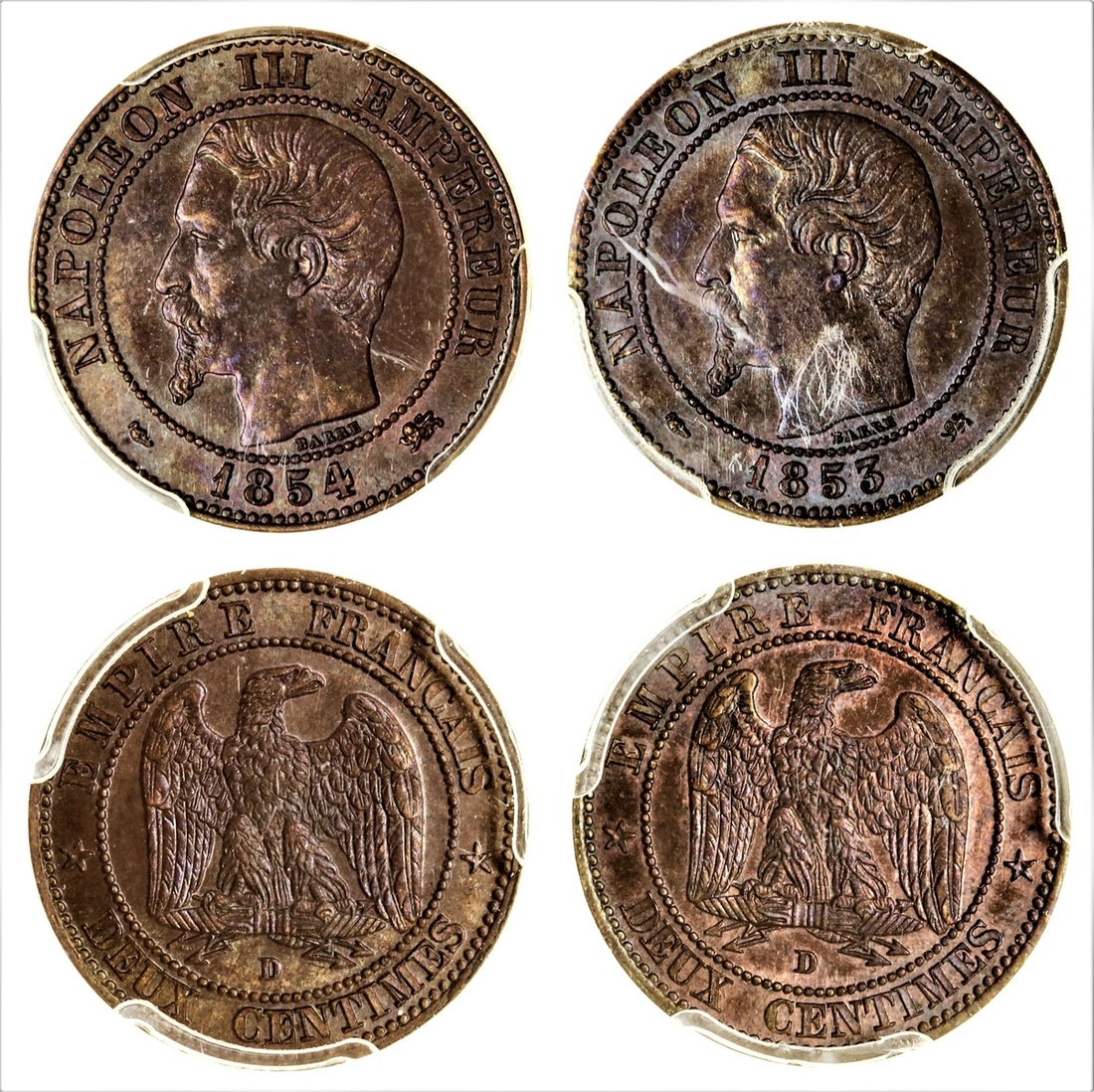 France, Second Empire, Napoléon III (1852-70), 2-Centimes [2], 1853-D, Lyon, 'small D' (Le Franc 107.5); another, 1854-D, Lyon, 'small D', big lion (Gad 103; Maz 2583), both with brown patina overlying lustrous original surfaces, scarce thus, in early PCGS holders, graded MS64BN and MS63BN respectively [2]