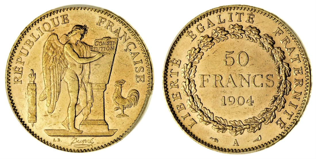 (g) France, Third Republic (1870-1940), gold 50-Francs, 1904-A, Paris (Le Franc 549; Gad 1113; KM 831), lustrous, scarce, in PCGS holder, graded MS62