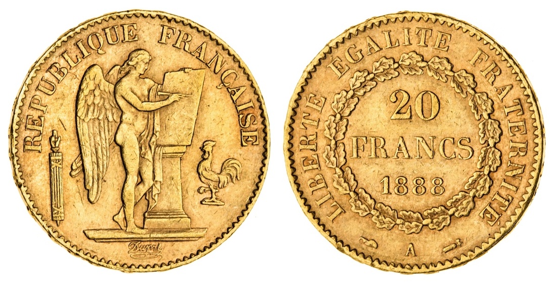 (g) France, Third Republic (1870-1940), gold 20-Francs, 1888-A, Paris (Le Franc 533; Gad 1063; Maz. 1810; Fb 592), about very fine, scarce