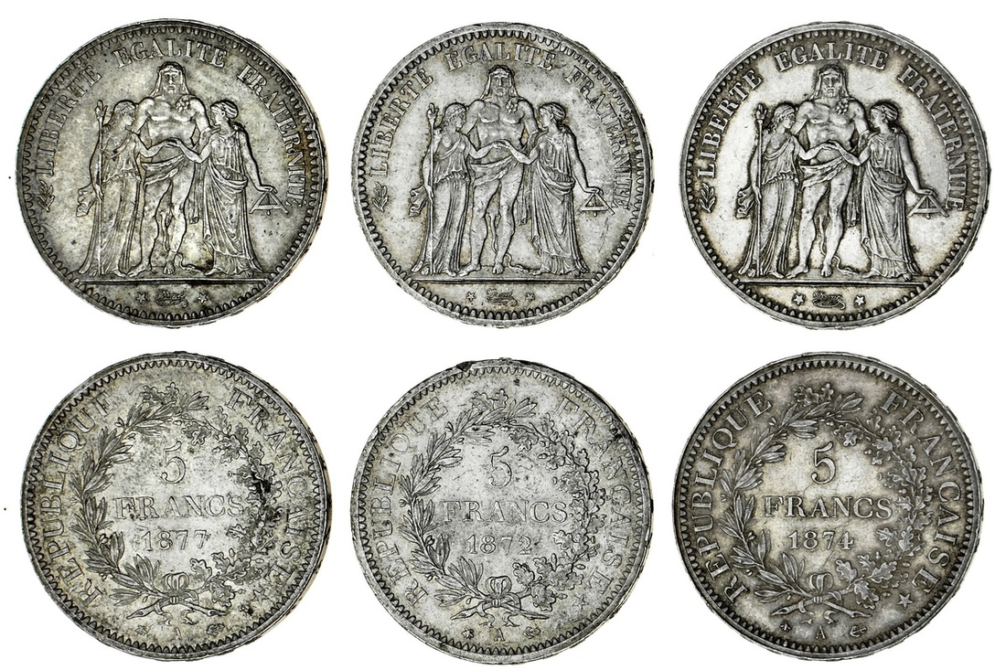 France, Third Republic (1870-1940), 5-Francs, "Hercules" type, Paris [A], {bee-anchor} (3), 1872-A, with stars; 1874-A; 1877-A (Le Franc 334; Gad 744; KM 820.1), all toned and lustrous, extremely fine or better (3)