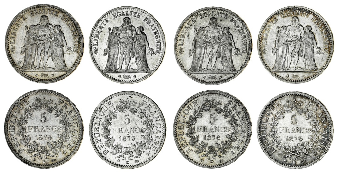 France, Third Republic (1870-1940), 5-Francs, "Hercules" type, Bordeaux [K], {cross-crosslet-anchor} (4), 1874-K; 1875-K; 1876-K; and 1878-K (Le Franc 334; Gad 744; KM 820.2), the second dipped, the last toned, good very fine, the rest lustrous, extremely fine or better, some scarcer dates (4)