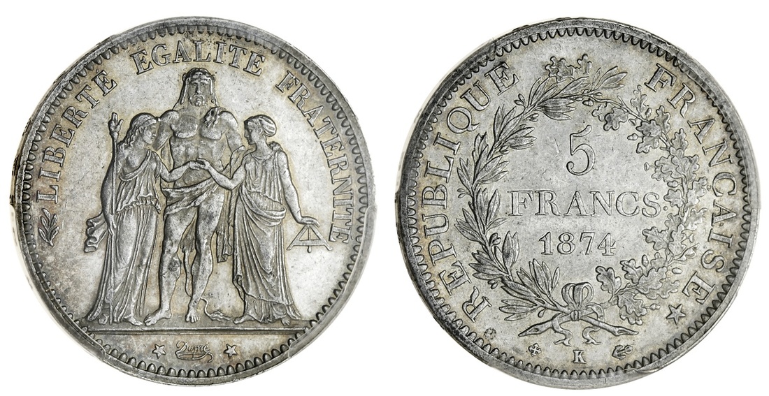 France, Third Republic (1870-1940), 5-Francs, "Hercules" type, 1874-K, Bordeaux (Le Franc 334; Gad 745a; KM 820.2), in PCGS holder, graded MS62