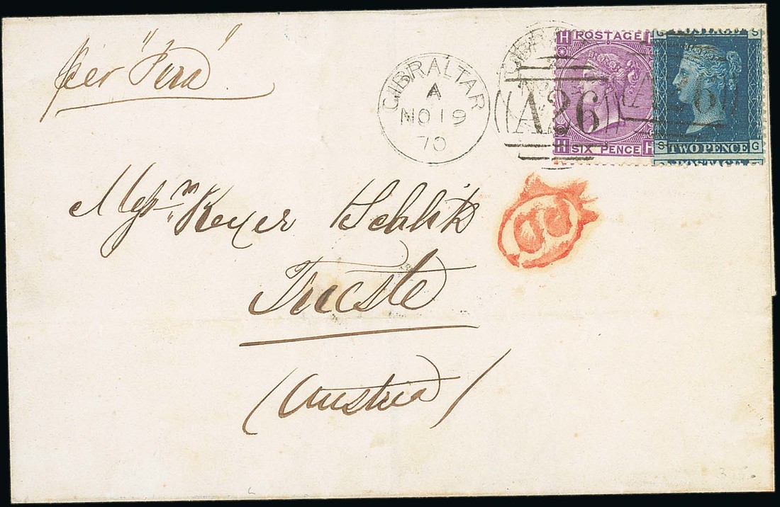 1870 (19 Nov.) entire to Trieste, bearing 2d. Pl. 8 and 6d. Pl.8 tied by "A26" duplex, showing oval-framed
