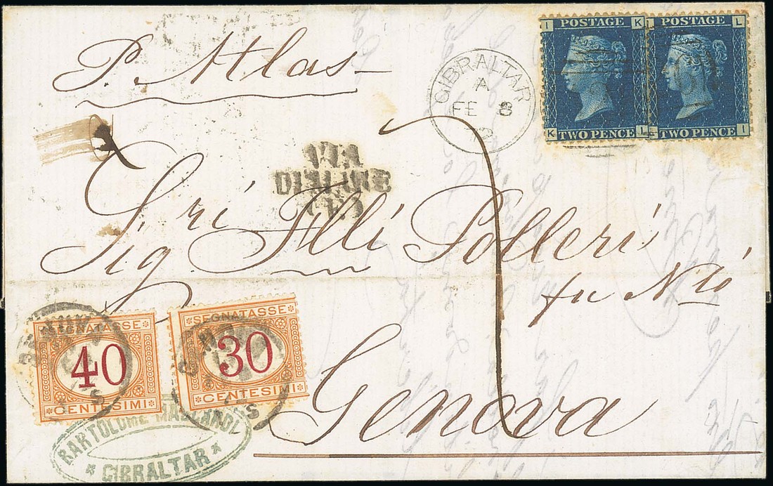 1872 (8 Feb.) entire letter to Genoa, marked P. Atlas", bearing 2d. Pl. 13 (2) tied by "A26" duplex, showing