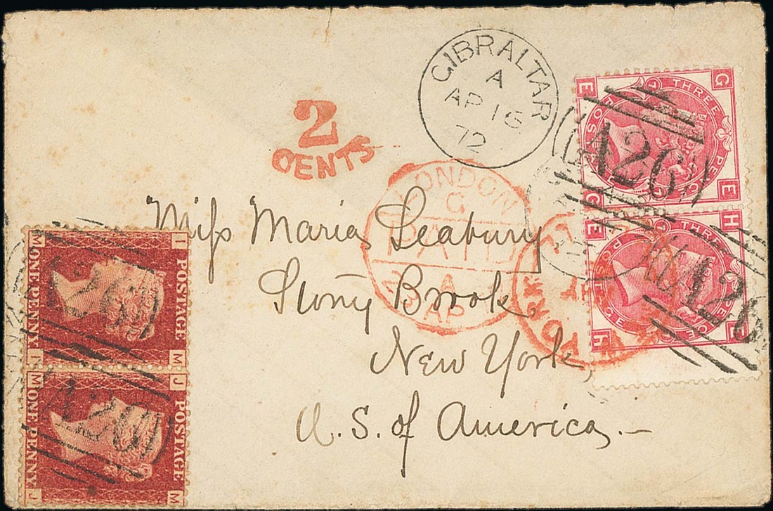 1872 (16 Apr.) envelope to New York, bearing 1d. pair and 3d. Pl. 7 pair, both tied by "A26" duplex, showing London Paid transit d.s., New York Paid All arrival d.s. (9.5) and