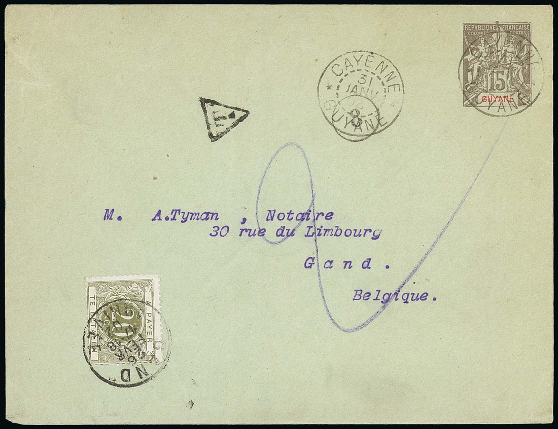1902 (31 Jan.) 15c. postal stationery envelope to Gand, Belgium, Cayenne/Guyane cancellation, underpaid by 10c. and taxed by 20c. Postage Due on arrival; fine