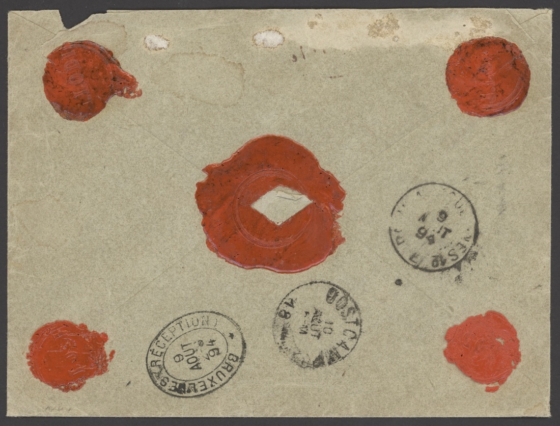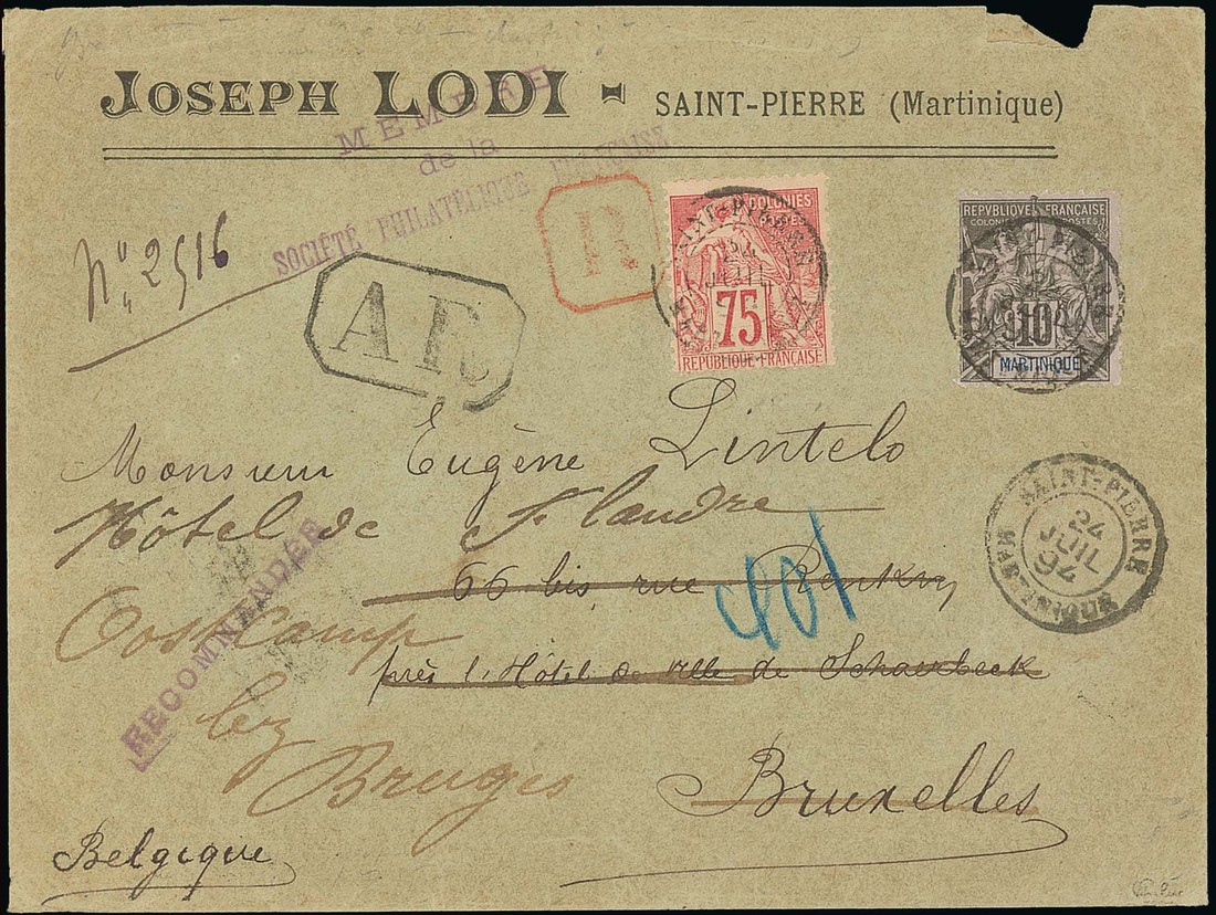 1894 (24 July) Joseph Lodi advertising "AR" envelope registered to Brussels, franked 10c. and Dubois 75c., St. Pierre/Martinique cancellations, transit and arrival markings on the reverse; small portion of the envelope missing but a scarce 85c. franking (50c. postage, 25c. registration and 10c. return receipt)