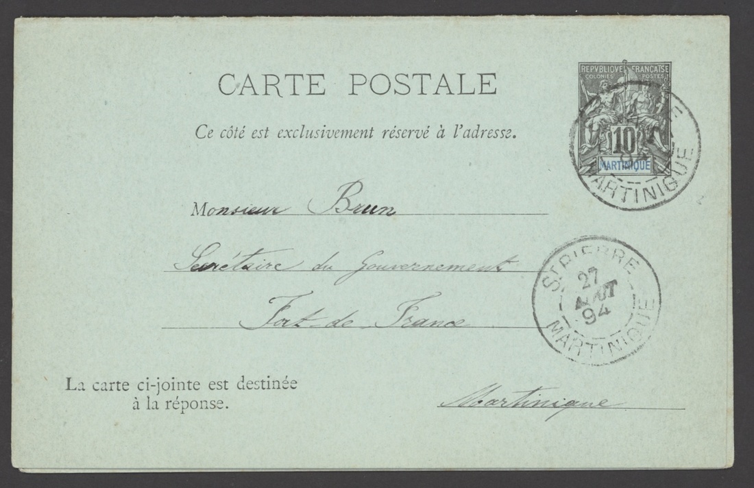 1894 (27 Aug.) 10c. + 10c. reply paid postal stationery card, used to Fort de France, St. Pierre/Martinique dotted circle cancellation, the attached reply portion returned to St. Pierre and with blue Fort de France/Martinique dotted circle cancellation; most unusual
