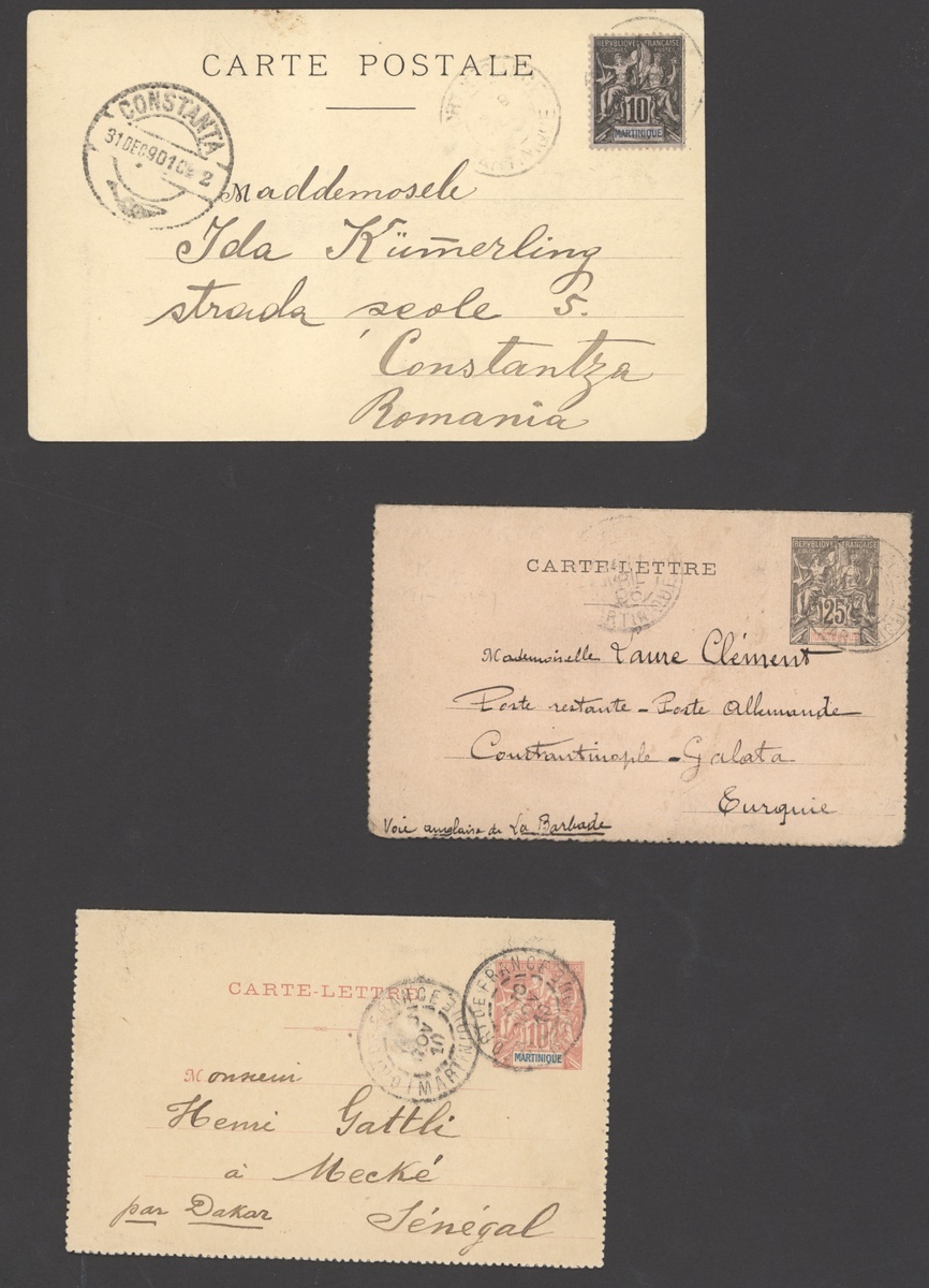1895 25c. postal stationery letter card (missing selvedge) to Turkey, 1901 p.p.c. (Le marché du Mouillage) franked 10c. to Roumania, 1903 to Java franked 15c., 1904 registered to Java franked 50c., 75c., 1910 10c. letter card (missing selvedge) to Senegal, all with Fort de France cancellations; mixed condition. Photo on our website