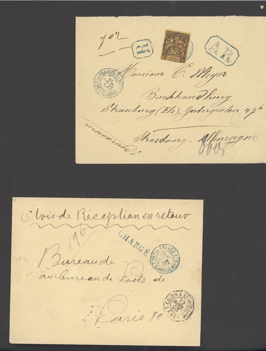 1902 (1 Dec.) "A.R." envelope to Germany franked 75c., 1903 (10 April) stampless envelope to Paris endorsed vis de Reception en retour, both with blue Fort de France datestamps; fine. Photo on our website