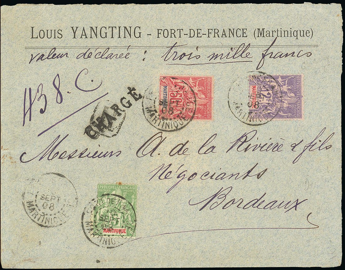 1908 (10 Sept.) declared value (3,000fr.) front to Bordeaux franked 5c., 50c. and 2f., Fort de France/Martinique cancellations; fine. Exceptionally rare use of the 2f.