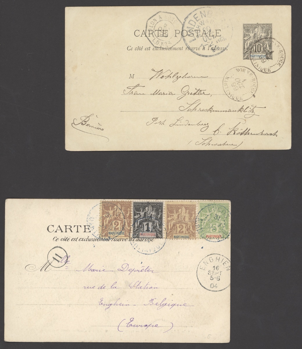Balata: 1905 p.p.c. (La Rue Saint-Louis) to Toulon franked 10c., Ducos 1904 p.p.c. (Les Trois Ilets) franked 1c., 2c. (2), 5c., Gros Morne 1905 p.p.c. to Toulouse franked 1904 "0f. 10" on 40c., Morne Rouge 1899 10c. postal stationery card to Bavaria; good to fine. Photo on our website