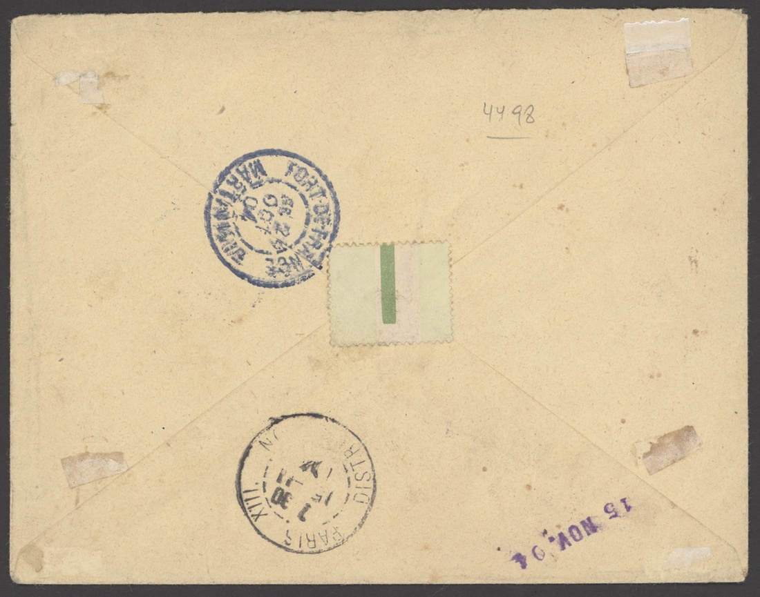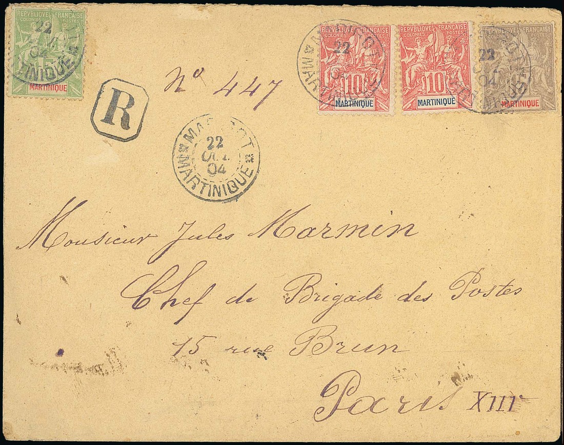 Marigot: 1904 (22 Oct.) envelope registered to Paris franked 5c., 10c. (2) and 15c. with Marigot/Martinique dotted circle cancellations, transit and arrival markings on reverse; fine