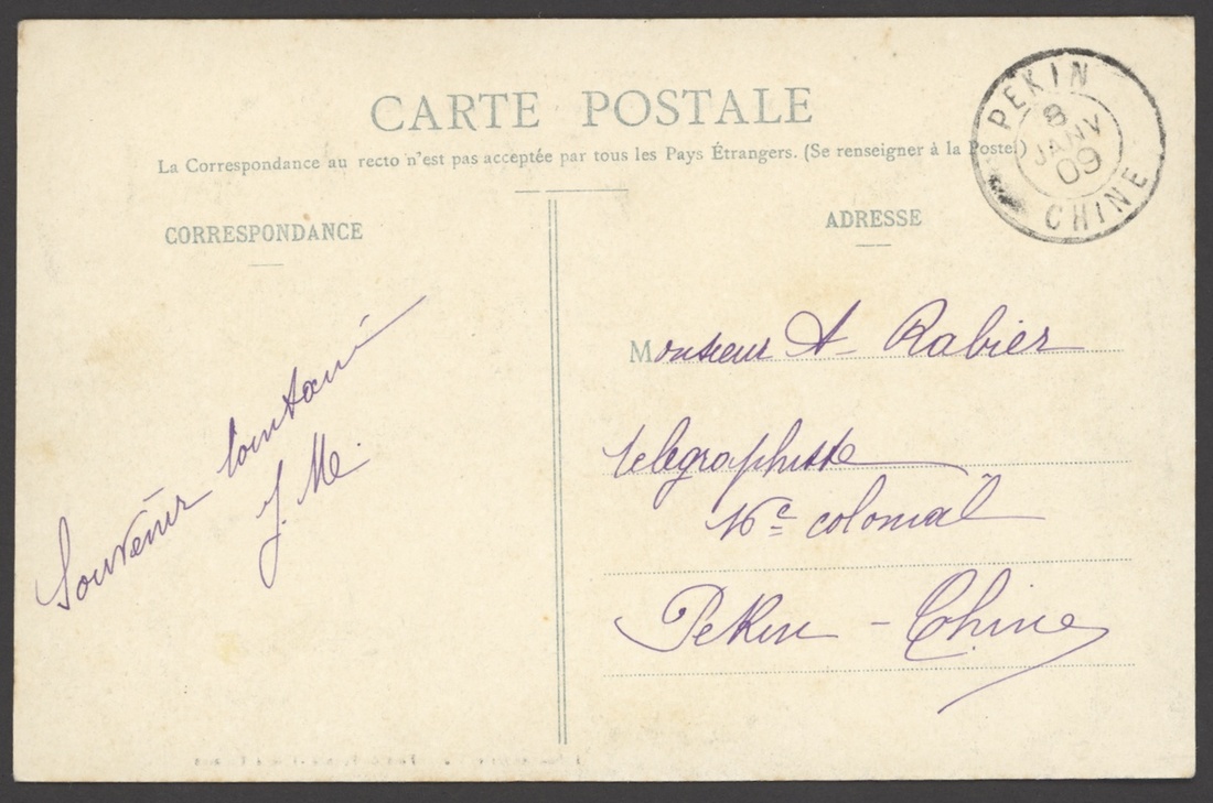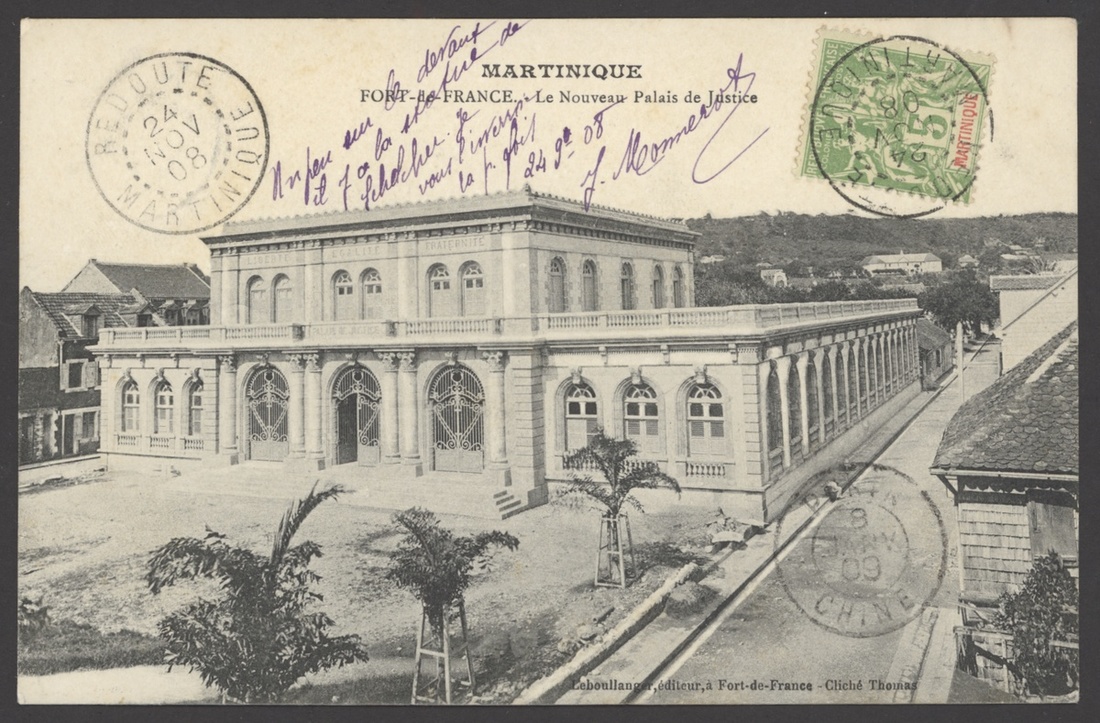 Redoute: 1908 (24 Nov.) p.p.c. (La Nouveau Palais de Justice) to Peking franked (on picture side) 5c. with Redoute/Martinique dotted circle cancellation, arrival datestamps on front and reverse; fine