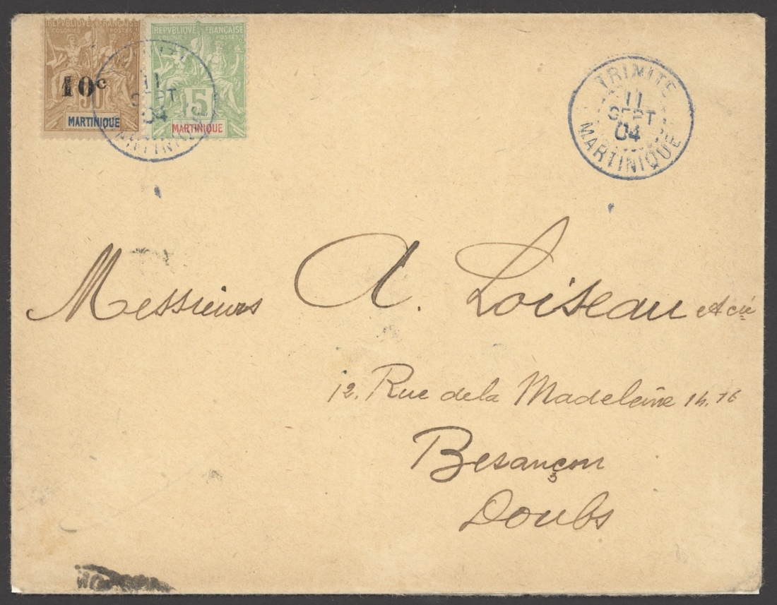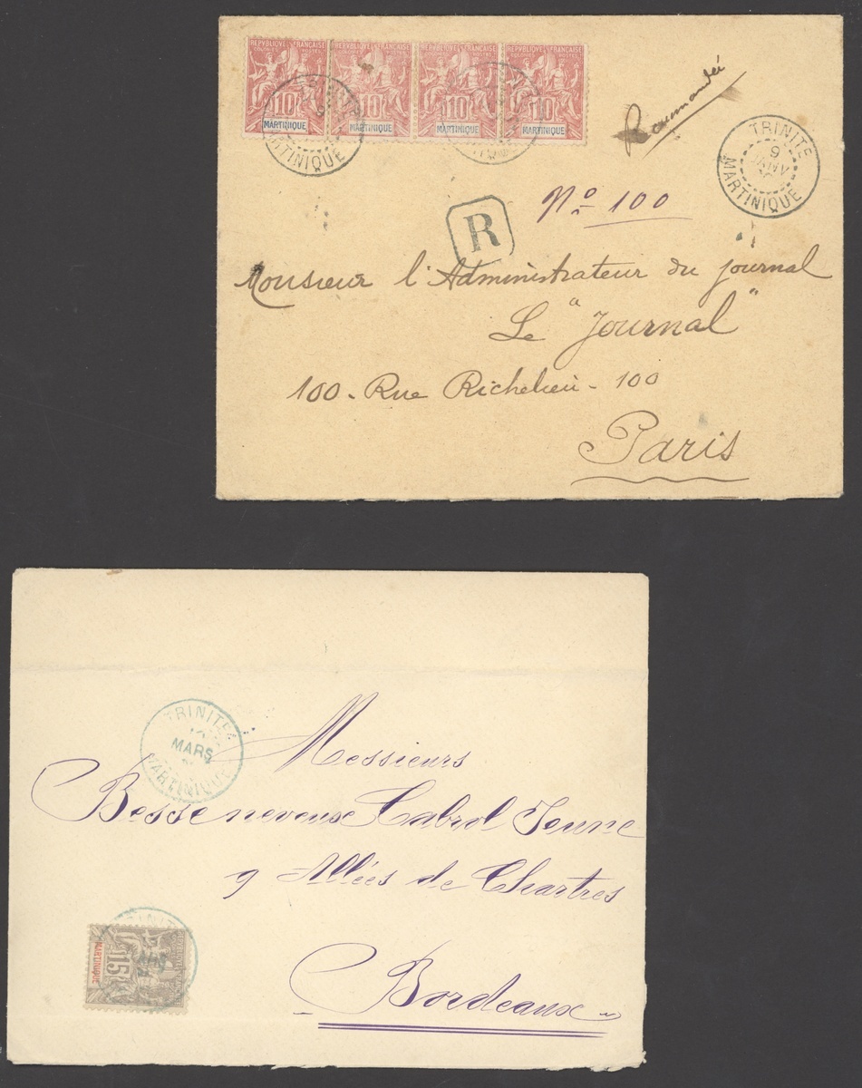 Trinite: 1903 (9 March) envelope registered to Paris franked 10c. strip of four, 1904 (10 March) envelope to Bordeaux franked 15c., 1904 (11 Sept.) envelope to Dubs franked 5c., 1904 10c. on 30c., Trinite/Martinique dotted circle cancellations in blue or black; good to fine. Photo on our website