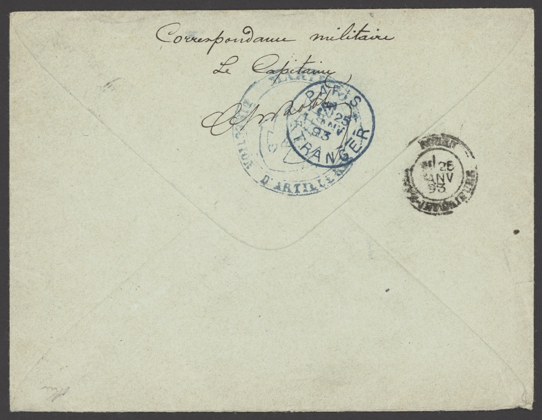 1893 (10 Jan.) 15c. postal stationery envelope to Rouen with octagonal Corr D'Armees/Fort de France cancellation, on reverse Military endorsement and cachet, transit and arrival datestamps; fine. The earliest recorded group type cover from Martinique