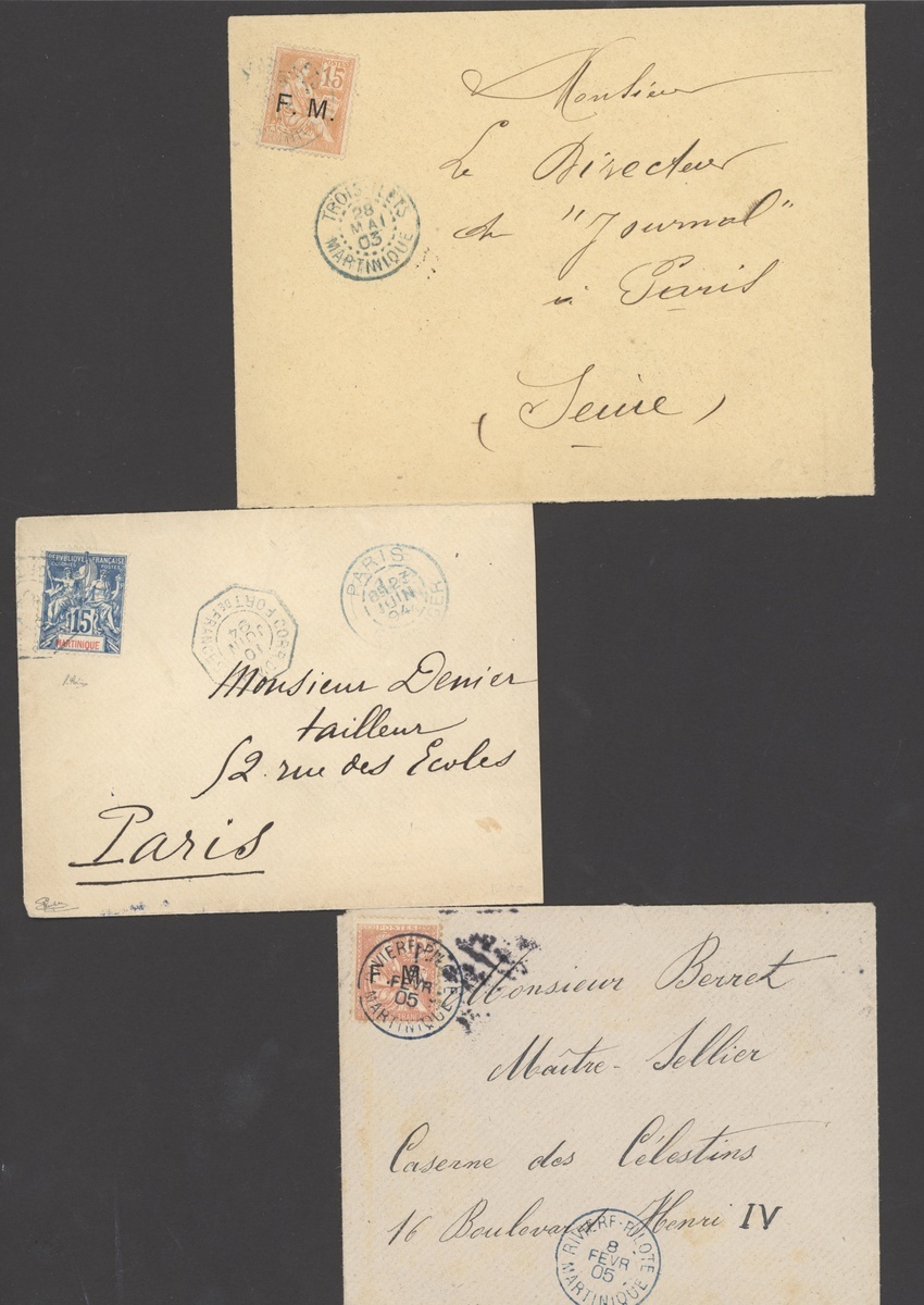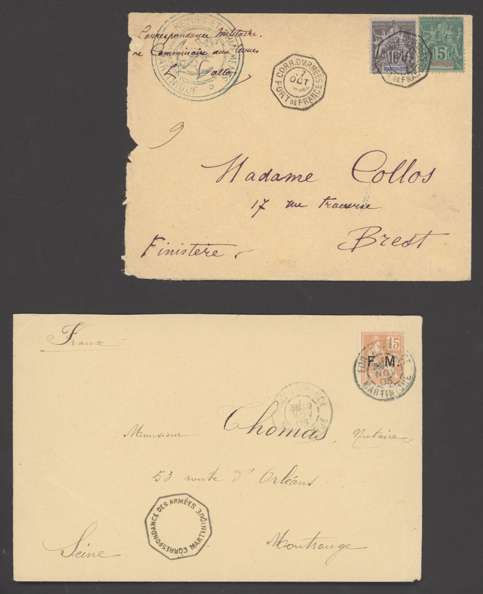 1893-1905, six covers, including 1894 to Paris franked 15c. with blue octagonal Corr D. Armees/Fort de France cancellation, 1903 to Montrouge franked France 1901 F.M. 15c. orange, 1903 to Paris franked France 1901 F.M. 15c. orange with blue Trois Ilets cancellation, 1905 to Paris franked France 1903 F.M. 15c. with blue Riviere Pilot cancellation, etc., chiefly good to fine. Photo on our website