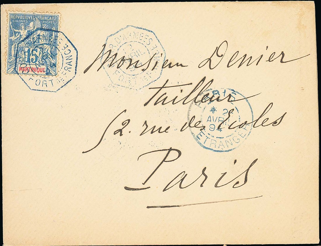 1894 (12 April) envelope to Paris franked 15c. with octagonal blue Corr D'Armees/Fort de France cancellation and with Paris Etranger in the same colour alongside, Military cachet on reverse; fine