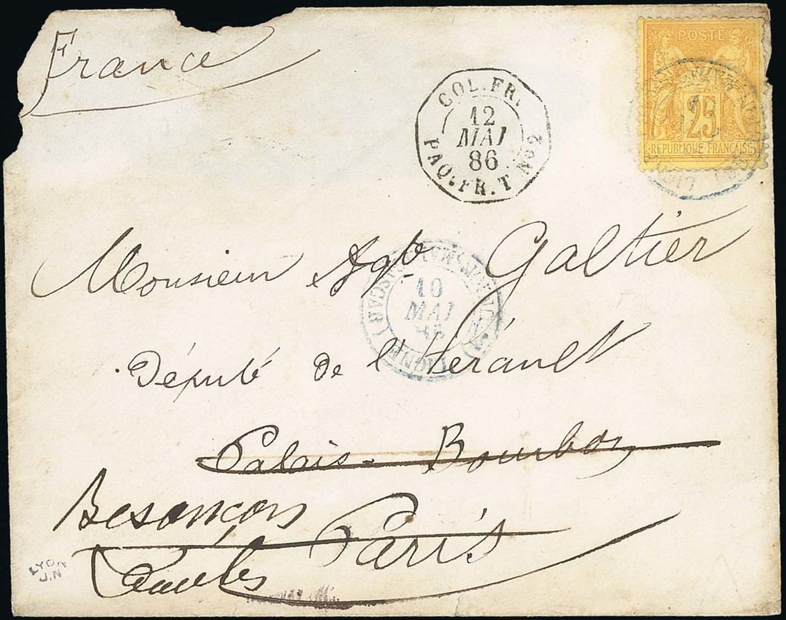 1886 (10 May) envelope to Paris franked Sage 25c. with blue Ligne (Reunion Madagascar) cancellation with octagonal Co. Fr./Paq. Fr. T. No 2 alongside; faults but mail from Madagascar at this period is extremely rare