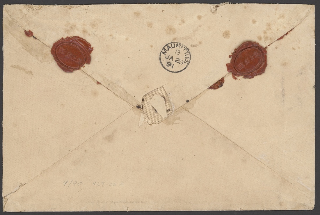 1891 (25 Jan.) large linen lined envelope to Mauritius franked Dubois 25c., 1f. (2) with Tamatave/Madagascar cancellations, arrival datestamps on reverse; some staining. A rare ninth weight franking