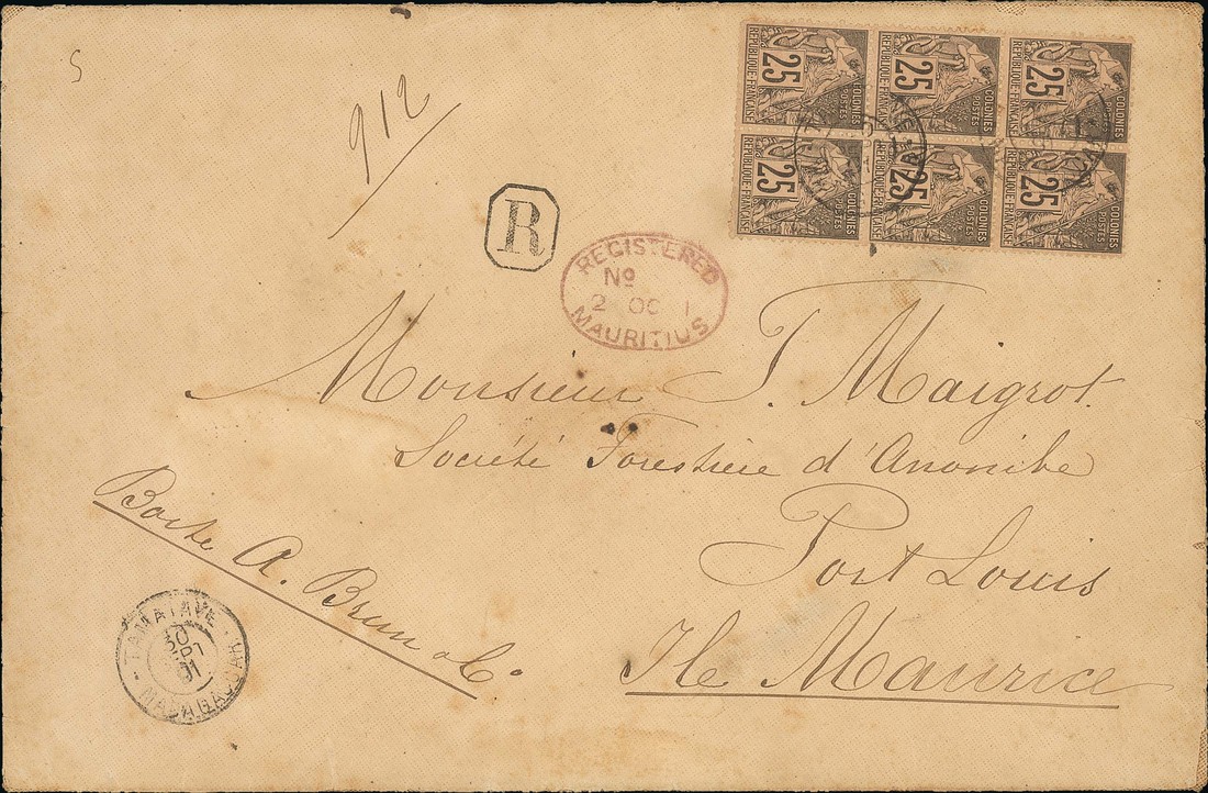 1891 (30 Sept), large linen lined envelope to Mauritius franked Dubois 25c. block of six (2x3) with Tamatave/Madagascar cancellations, red oval