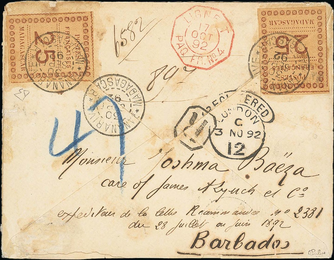 1892 (30 Sept.) envelope to Barbados franked (on the reverse) 1891 typeset 25c. brown on buff (2), Tananarive/Madagascar dotted circle, red Ligne T/Paq Fr No. 4 alongside, hooded London registered datestamp (3.11), Barbados (21.11) arrival on the front: some staining and minor faults but most probably a unique franking. Signed Calves
