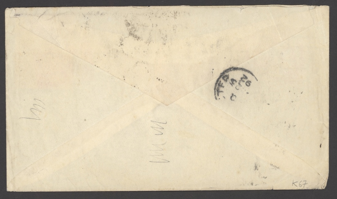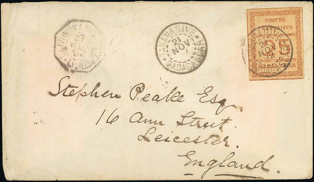 1892 (21 Nov.) envelope envelope to England franked 1891 typeset 25c. brown on buff, Tananarive/Madagascar dotted circle and with an octagonal transit alongside, arrival on reverse