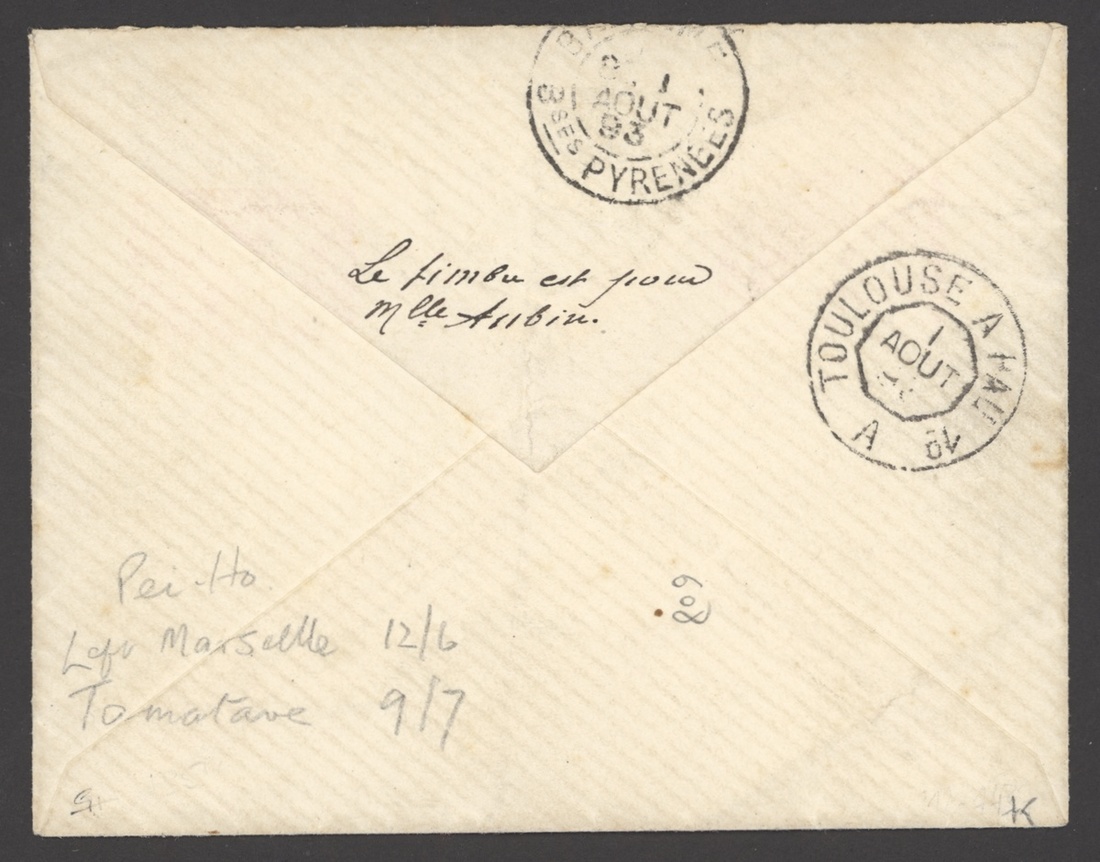 1893 (9 July) envelope to Bayonne franked 1901 typeset 25c. brown on buff tied by octagonal Marseille a la Reunion/L.V. No. 2 cancellation, transit and arrival markings on the reverse; light vertical fold, fine