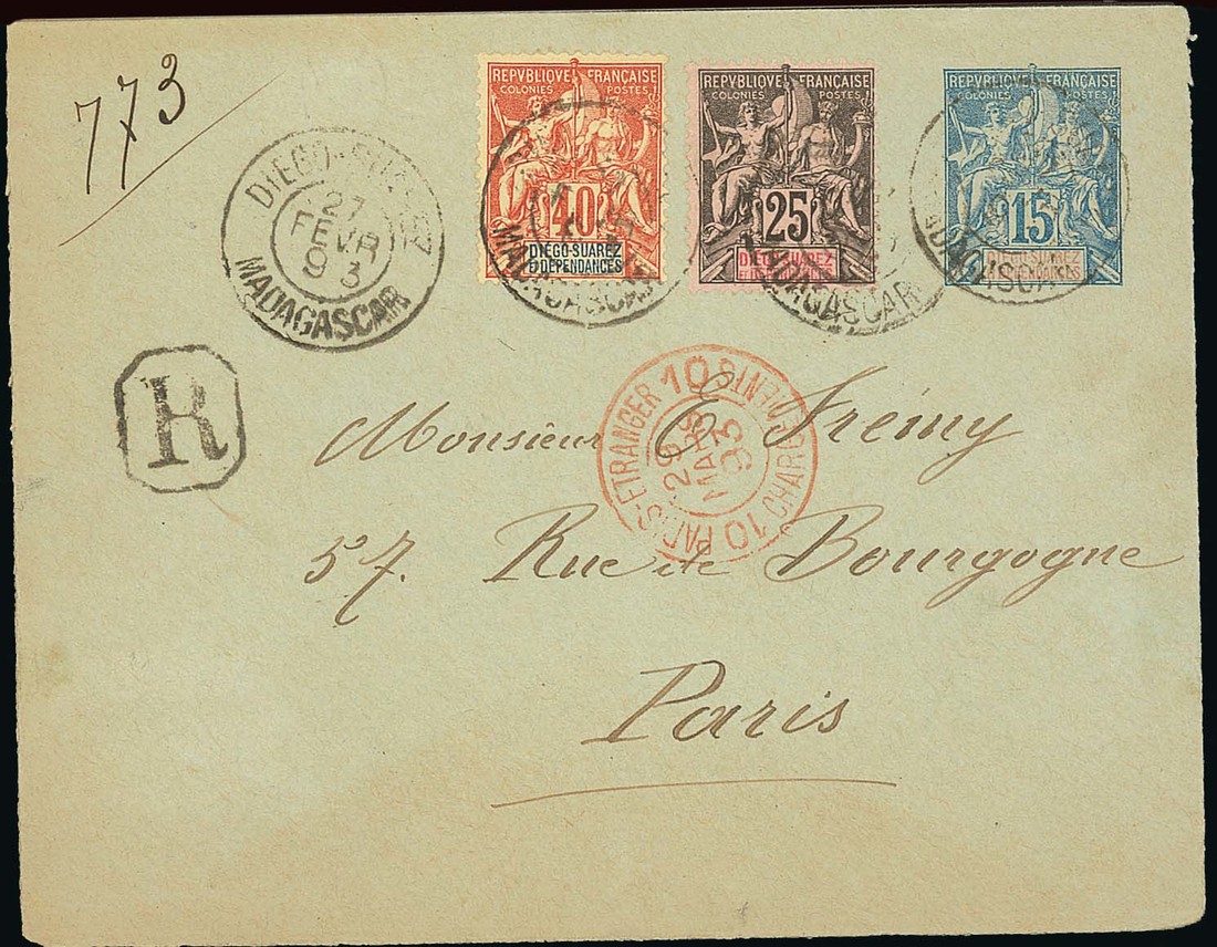 1893 (27 Feb.) 25c. postal stationery envelope, additionally franked 25c. and 40c., registered to Paris, Diego-Suarez/Madagascar cancellations and with red 10 Paris-Etranger 10/Chargements below, transit and arrival markings on reverse, fine and a scarce early double weight registered letter overpaid by 5c.