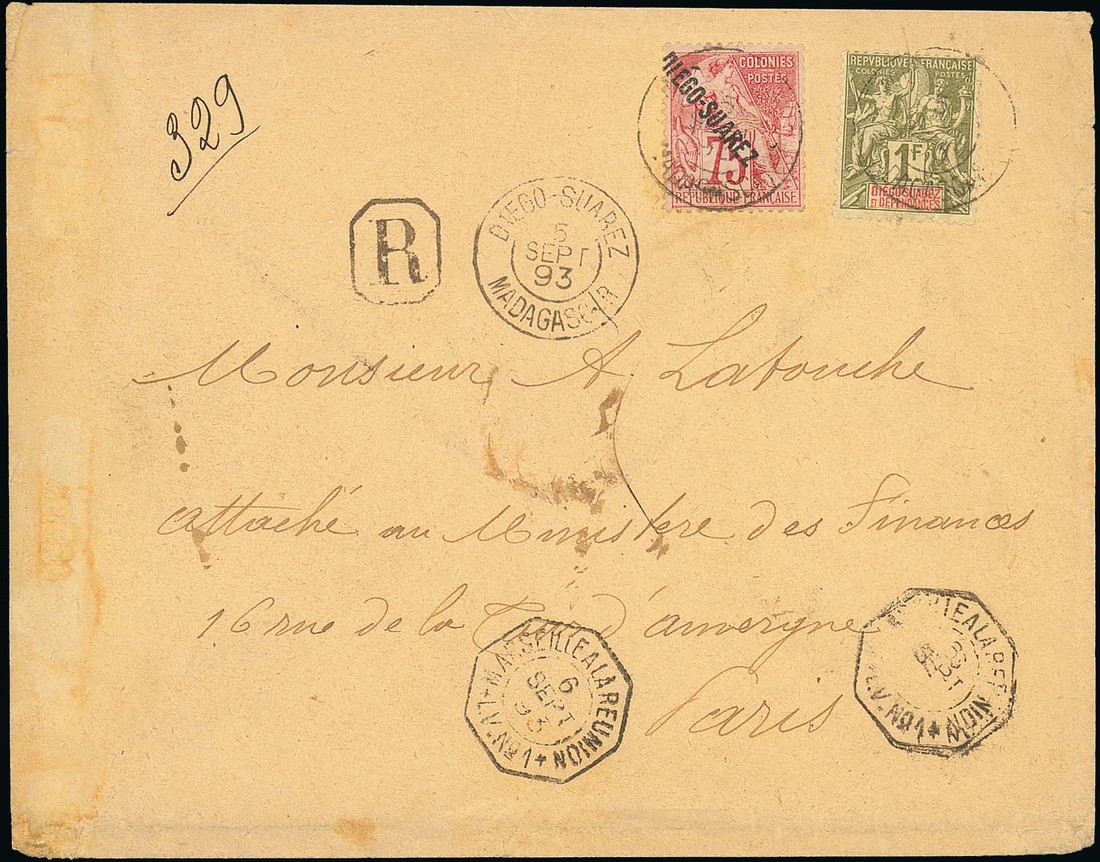 1893 (5 Sept.) envelope registered to Paris franked 1f., 1892 Dubios diagonal diégo-suarez 75c., Diego-Suarez/Madagascar cancellations and with octagonal Marseille a la Reunion/L.V. No 1 below, arrival datestamp on reverse; fine and a rare sixth weight registered rate (postage 6 x 25c., registration 25c.)