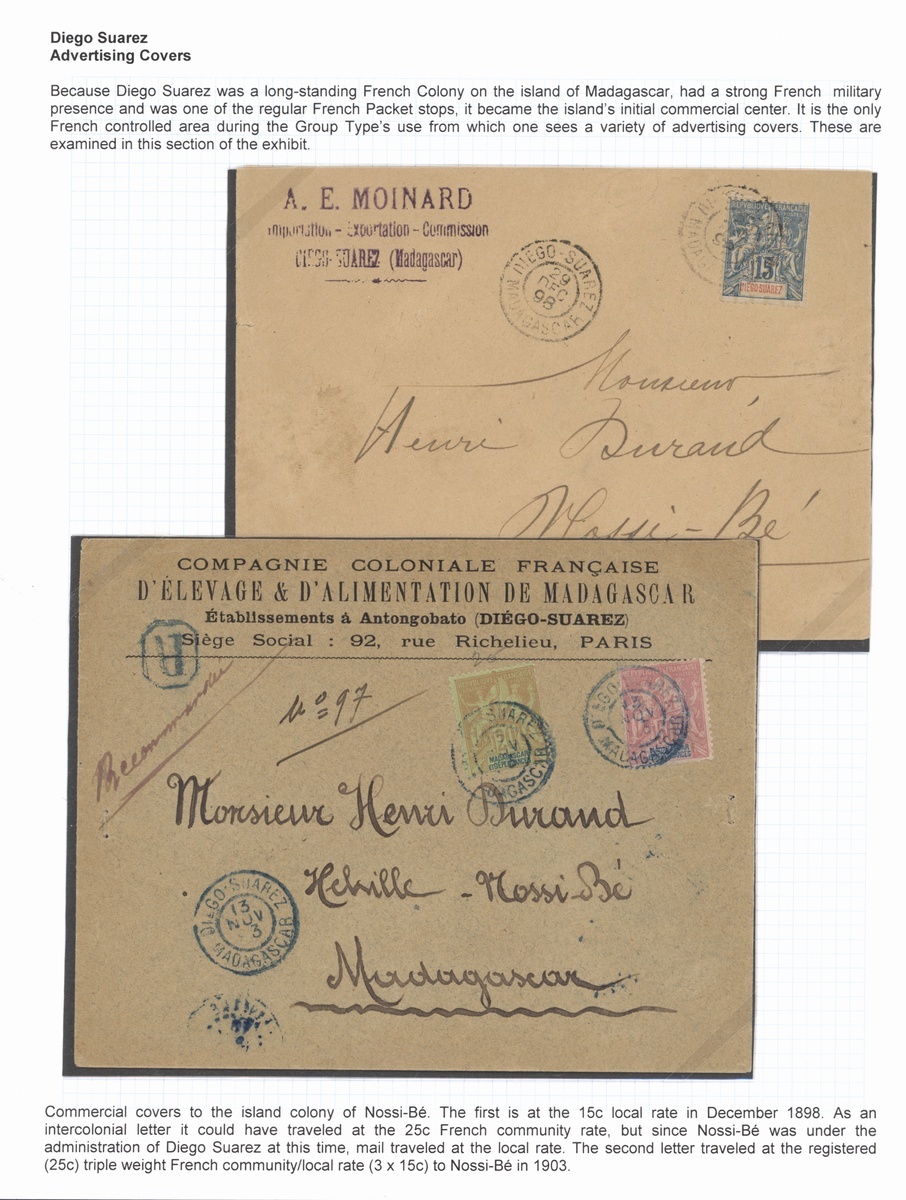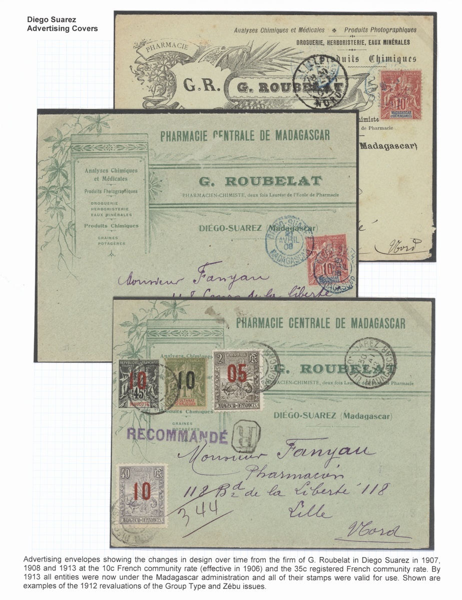 1894-1913 a group of seven items, including 1904 Parcel tag franked 20c., 40c., with blue Diego-Suarez cancellations (faults but rare), advertising covers, etc., chiefly good to fine. Photo on our website