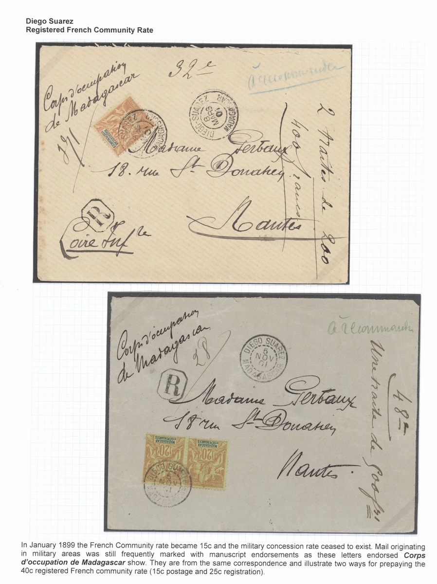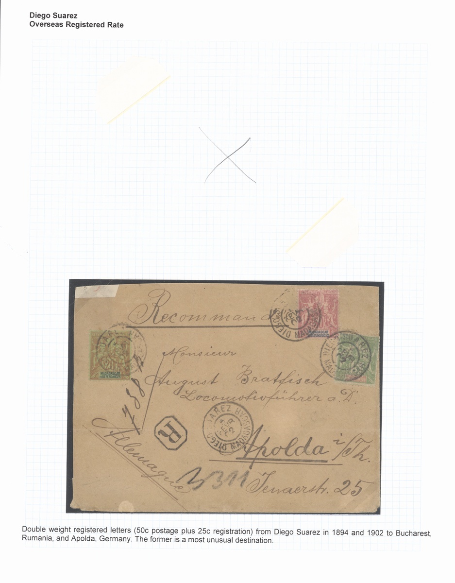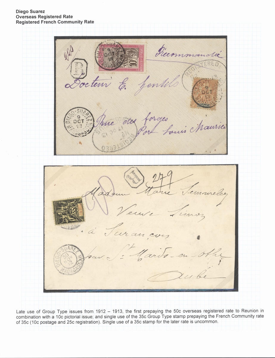 1901-13 group of five registered letters to France or Germany, a variety of frankings, including two from the same correspondence to Nantes endorsed Corps d'occupation de Madagascar, good to fine. Photo on our website