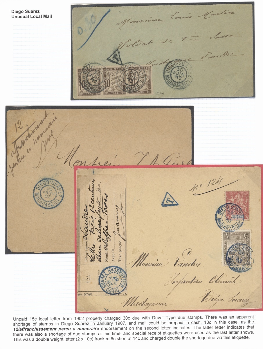 1902 (30 June) unpaid cover taxed 10c. postage due strip of three on arrival; 1907 (23 Jan.) stampless letter with manuscript 12/affranchissement percu a numeraire, 1907 (28 Jan.) letter franked 10c., 1903 Zebu and Lemur 4c. underpaid by 6c. and with explanatory slip; fine. Three interesting local letters. Photo on our website