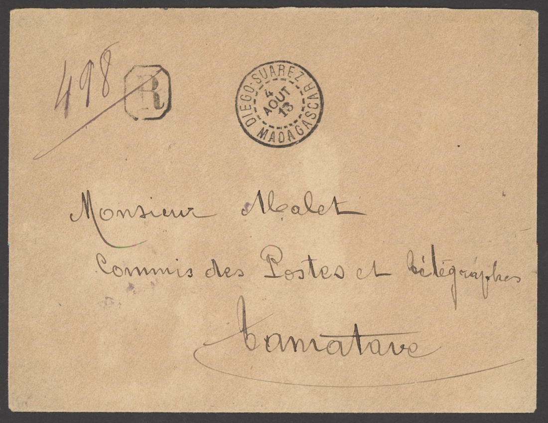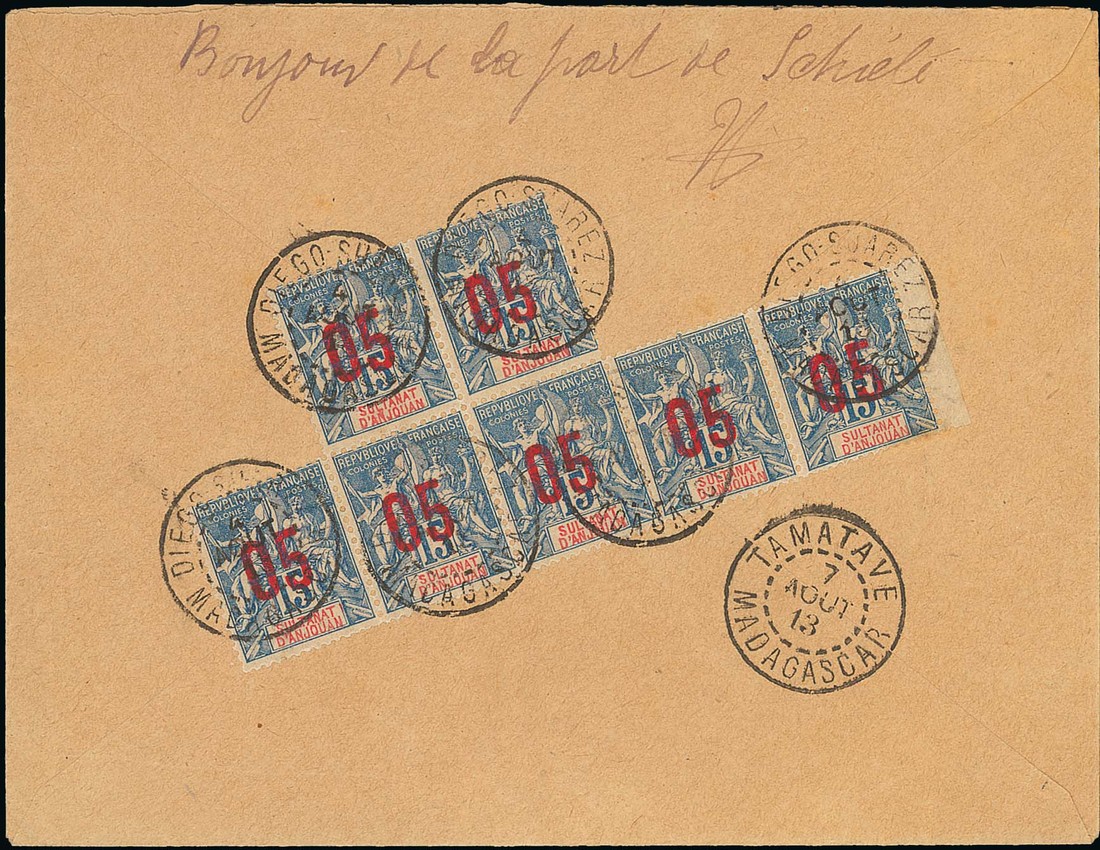 1913 (4 Aug.) envelope registered to Tamatave franked (on reverse) 1912 "05" on 15c. (pair, strip of four) with dotted circle Diego-Suarez/Madagascar cancellations, Tamatave arrival (7.8), fine